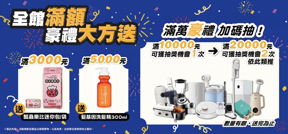 消費滿10,000元 獲 萬元豪華家電抽獎機會 乙次 (消費滿20,000元可獲得兩次,以此類推。)
