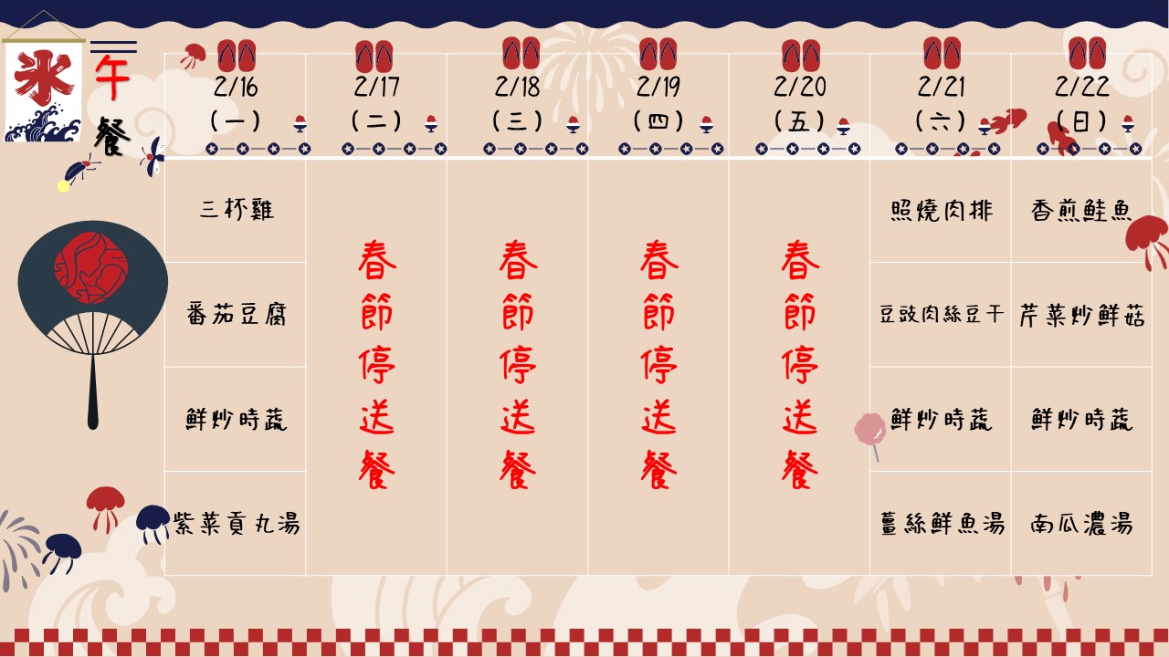 115/2/17(初一)~2/20(初四),過年休息不送餐,2/21恢復正常送餐。