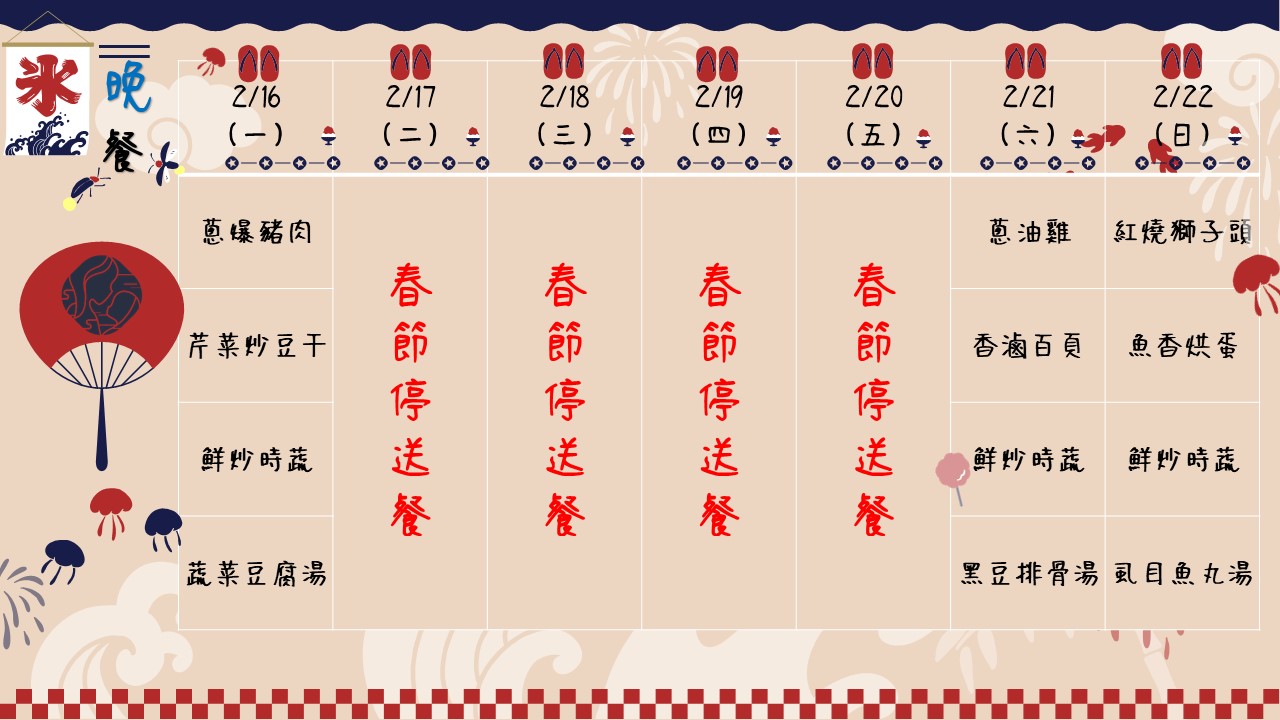 2/16~2/22午晚家庭餐菜單(2/17~2/20休息不送餐)
