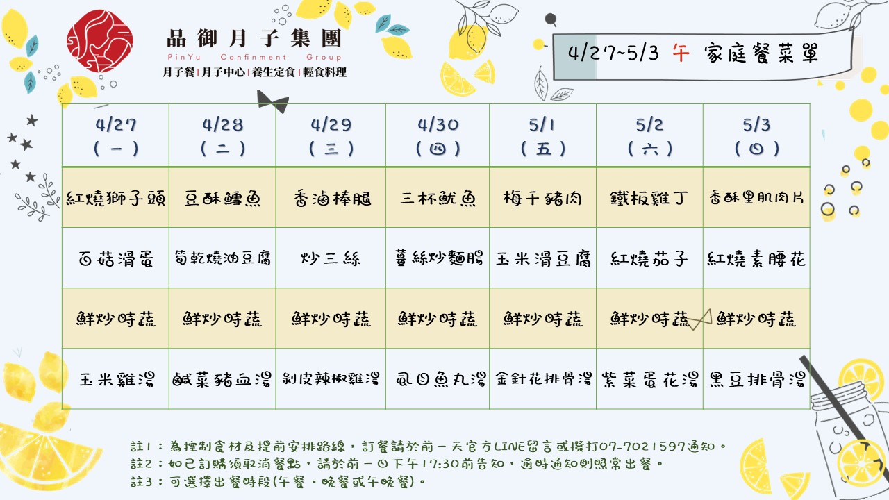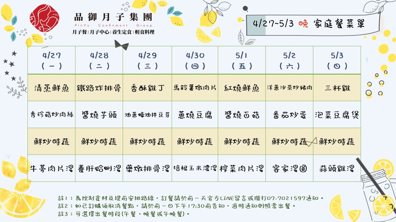 4/27~5/3午、晚家庭餐菜單