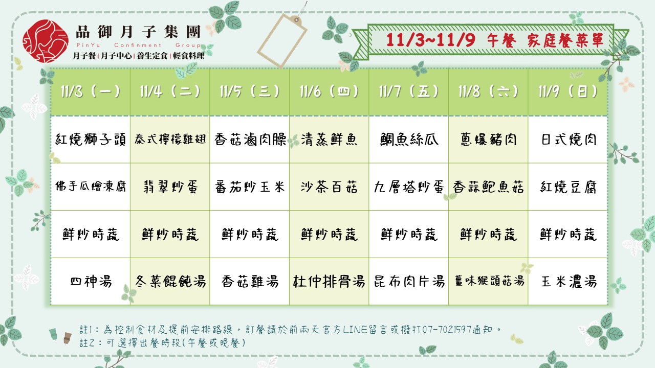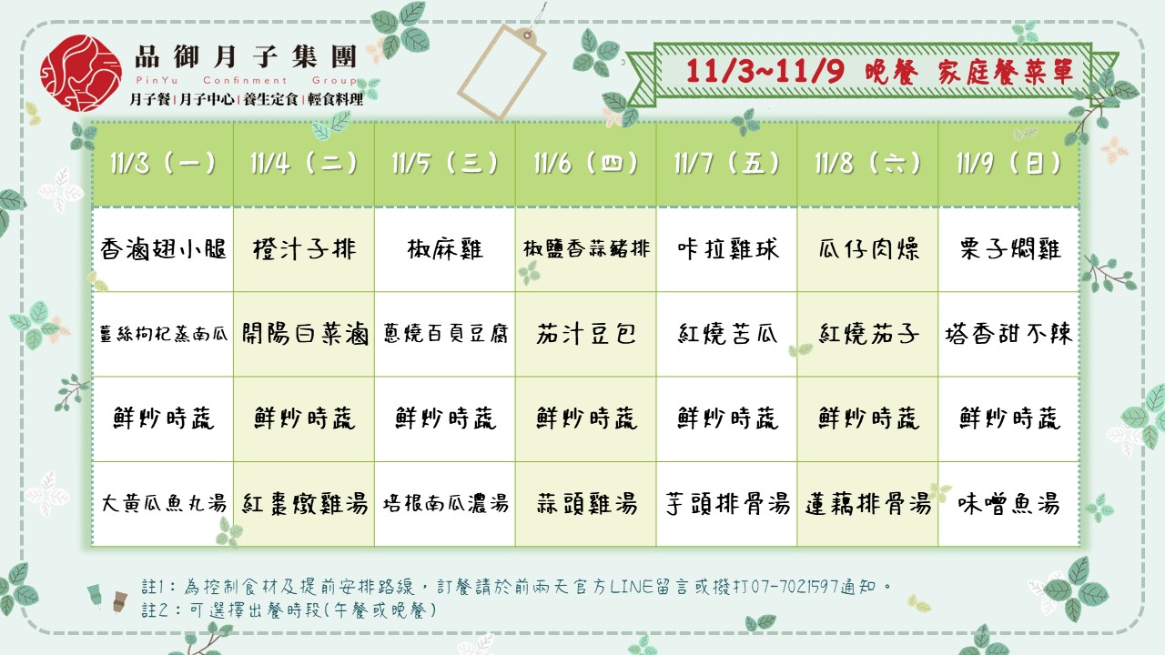11/3~11/9午、晚家庭餐菜單