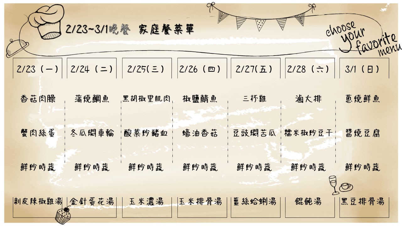2/23~3/1午、晚家庭餐菜單